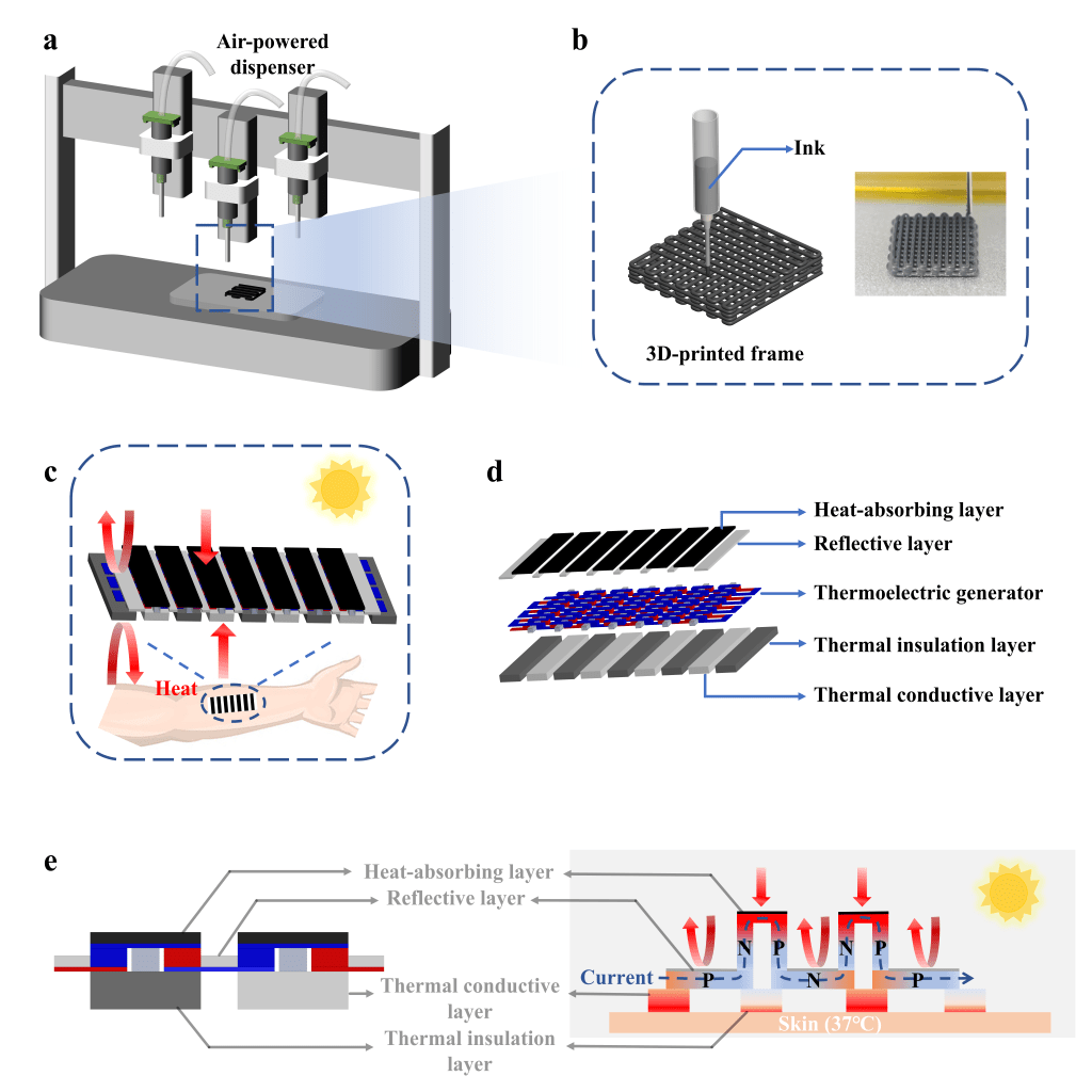 (a)3D打印机墨水直写技术(DIW)示意图 (b)框架结构可打印性测试 (c)可穿戴热电器件示意图 (d)吸热层、反射层、热电发电机、隔热层、导热层示意图 (e)热电器件横截面及电流方向示意图