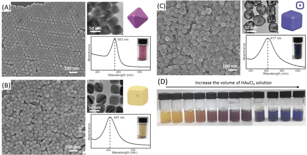 SEM图像,TEM图像(左上插图),几何模型(右上插图)紫外线-可见光(UV-VIS)光谱(下插图)。(A)金纳米粒子。(B)金@银核-壳纳米粒子。(C)金/银空心纳米粒子。(D)含有金/银纳米粒子的小瓶,由金@银核-壳纳米粒子溶液与不同体积的20 mM的HAuCl4溶液。