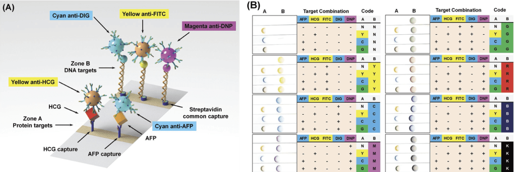 Two-parameter multiplexing based on spatial separation and color co-localization. A) Detection schematics. Cyan, magenta, and yellow NPs are represented by spheres of their respective colors. B) Multiplexed detection of all 32 possible target combinations. Target combinations were reported by the location and the color of the test spot. Co-localization of multiple primary NPs resulted in unique secondary colors.